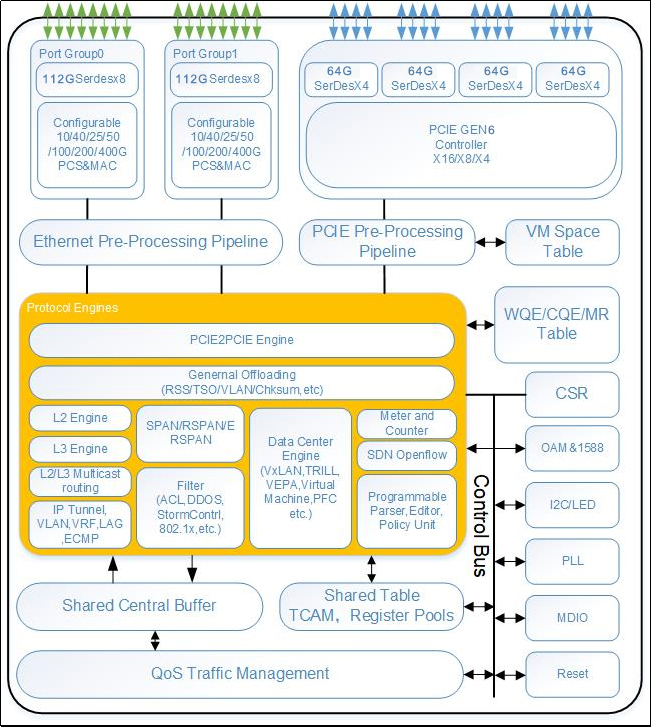 GBX-4是国半半导体自主研发设计的结合以太网控制器技术和以太交换技术研发设计的高性能网卡芯片,可应用于有高密度接口和高性能通信需求的服务器。GBX-4网卡芯片支持200/400/800GE端口速率,支持1024Gbps的PCI Express有效带宽,通过SR-IOV虚拟化4个PF、256个VF以太网卡功能。支持DPDK加速增强功能,可提高性能,释放处理器资源。支持vSwitch的互连交换硬件加速功能,释放处理器资源,并有效降低成本。